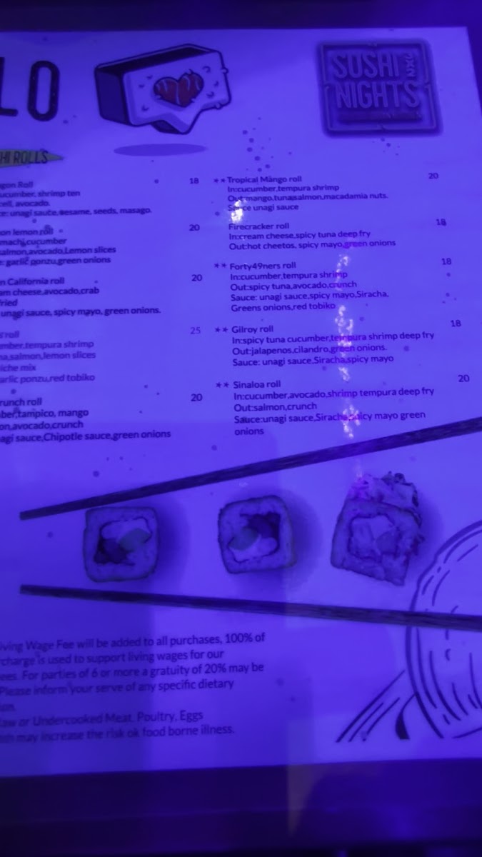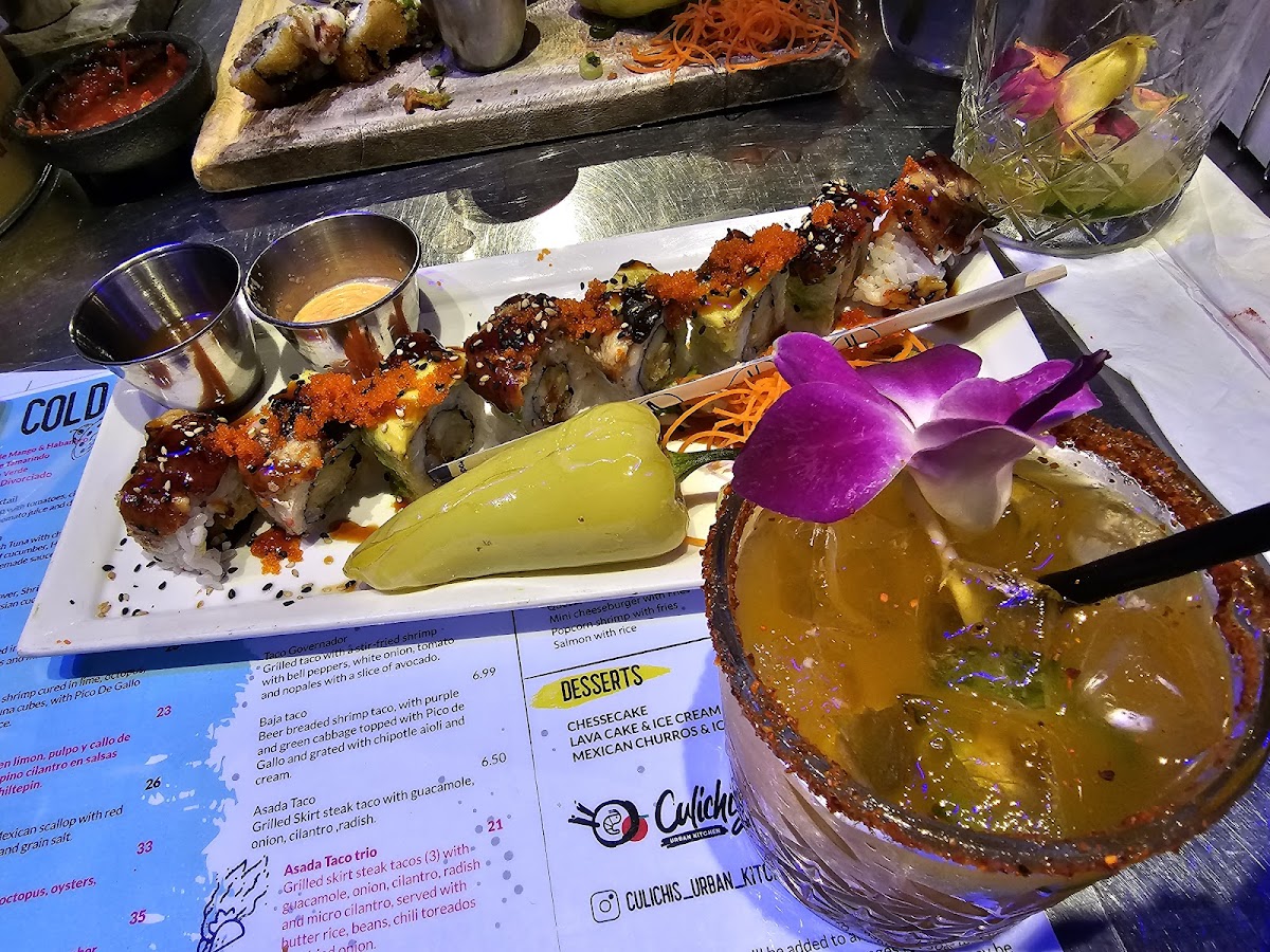 Inside: tempura shrimp, avocado and cream cheeseOutside: hot Cheeto powder