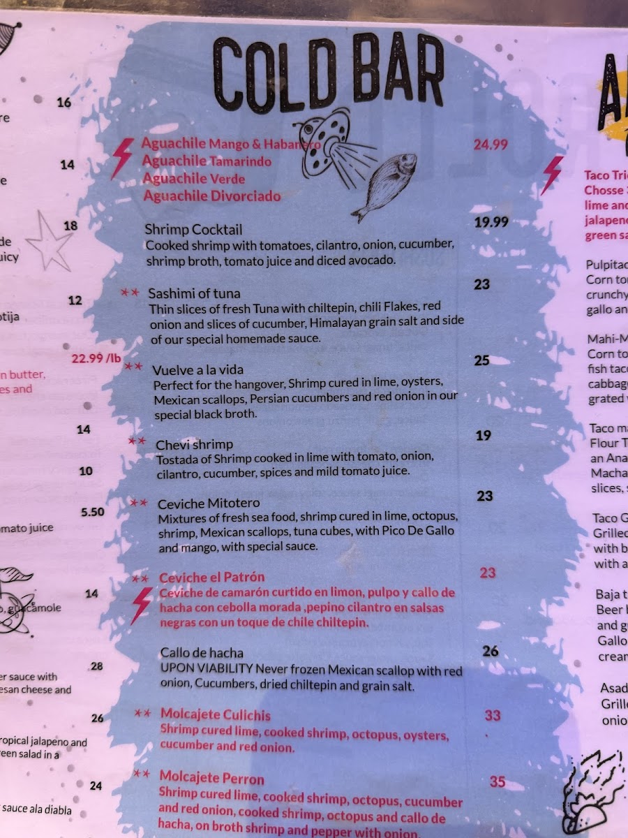 1/2 Docena $15 Docena $28Oyster red prep, ceviche shrimp, octopus and callo