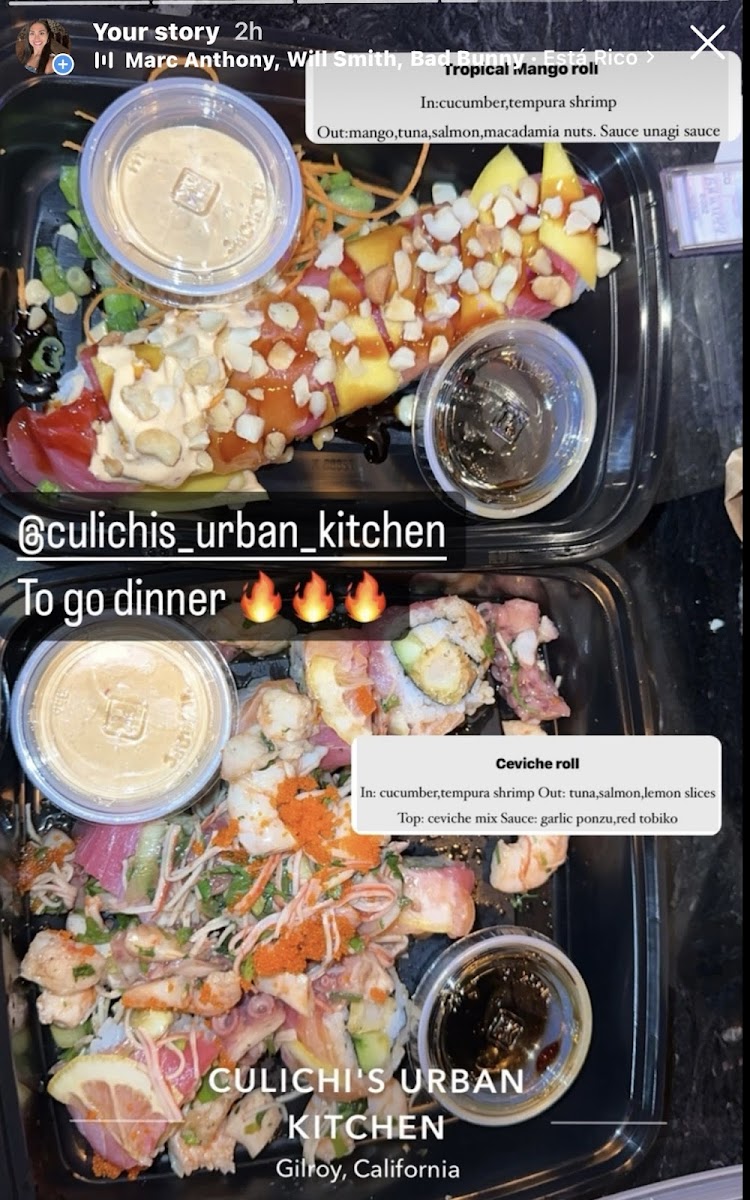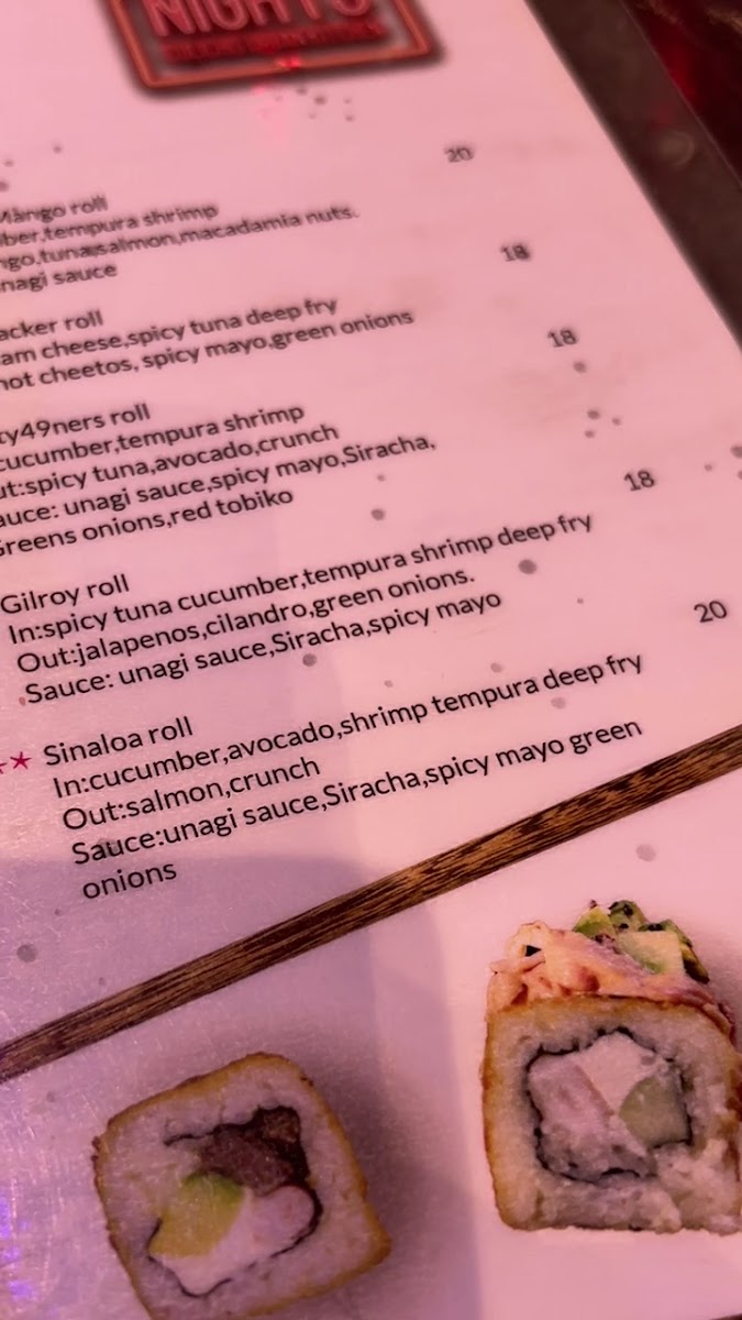 Inside: cucumber, and kanikamaOutside: slices of avocadoOn top: fresh salmon an tuna cubes, and tampico, sesamed seeds and eel sauce